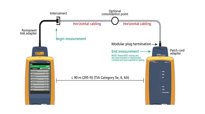 The DSX CableAnalyzer™ is capable of certifying MPTL by using a patch cord adapter on one end and a permanent link on the opposite end (see image below).