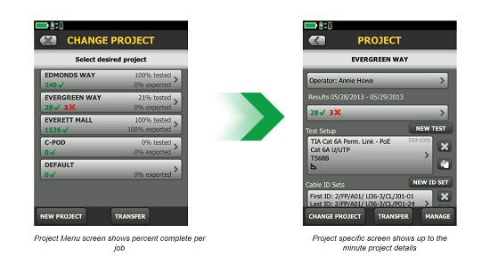 Managing the testing of multiple jobs with multiple teams, testers, and requirements is time consuming and a source of errors. Increasingly larger jobs make project organization more important than ever. The ProjX management system on the DSX CableAnalyzer Series provides individual project files for all job specific details to be saved under a simple name, eliminating the need to re-enter job specific details after starting a project. This minimizes set-up errors or lost files when switching from one job to another or utilizing multiple testers on a single job. In addition, it provides test results by cable ID, merges any changes without duplicates and defaults to the last copper or fiber module installed. ProjX management system provides real time status to completion on each job with a 0-100% scale and gives the operator the option to isolate any test requiring a second look and helps to assure nothing is overlooked. The “Fix Later” selection creates a punch list or automatic to do list for correcting any workmanship issues. ProjX enables project managers and crew leaders to be truly efficient.