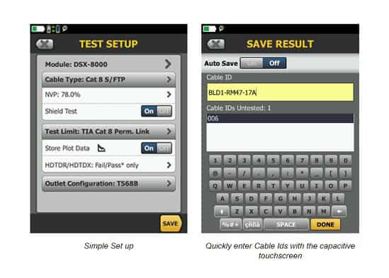 - Capacitive touchscreen allows quick tester setup with easily selectable cable types, standards and testing parameters